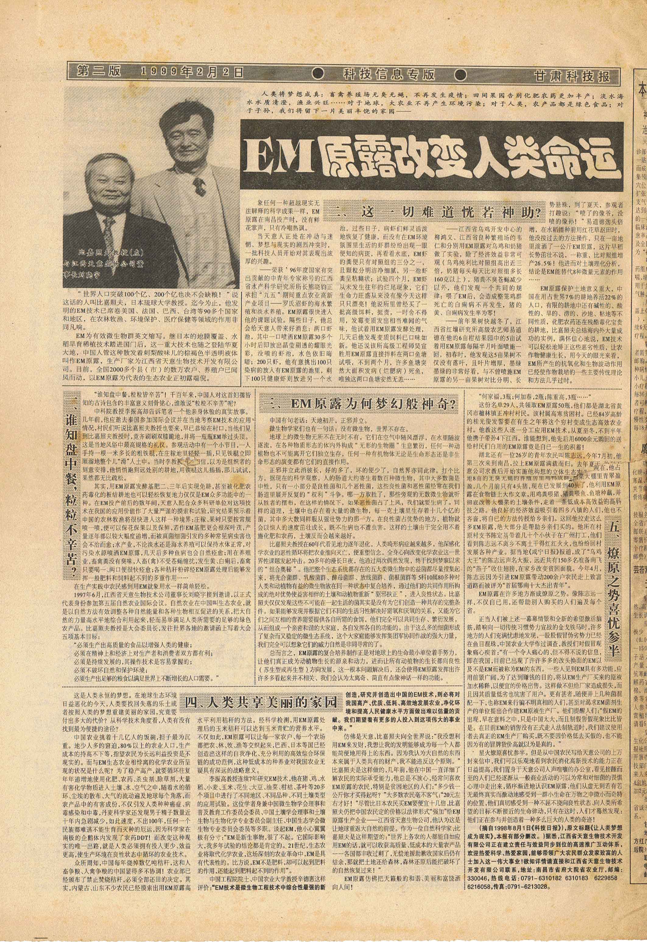 1999 1999年初,中央人民廣播電臺每天早晚對農村廣播的黃金時間開始播放全國各地農民使用EM原露的小故事,在該臺農村部撤消之前的六年時間里,每天播放農民們的自發來信在全國農村引起了廣泛反響。多地政府部門開始自主下文推廣EM原露。